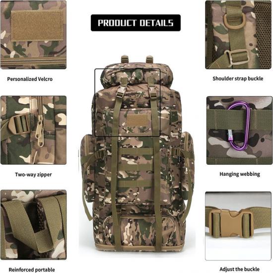 Цей рюкзак виготовлений з міцної тканини Oxford 900D, яка витримує великі навантаження. З об'ємом 70 літрів, він має достатньо місця для всього вашого спорядження та необхідних речей.