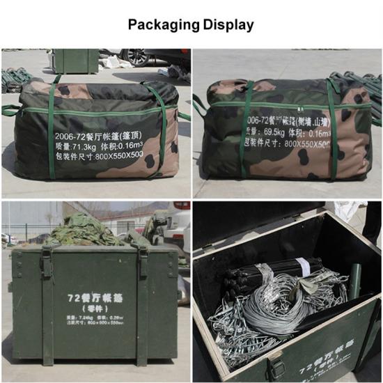 Коли трапляються стихійні лиха, будь то повені, лісові пожежі чи землетруси, наш аварійний намет — це ідеальне рішення. Він широко використовується для ліквідації наслідків стихійних лих, забезпечуючи негайний захист постраждалих. Військові використовують його для швидкого облаштування таборів під час операцій, а медичні бригади перетворюють його на зручний пункт першої допомоги. Він також є популярним вибором для пожертвувань Організації Об'єднаних Націй, ресурсів для надзвичайних ситуацій, що зберігаються урядом, та місій з надання допомоги Червоному Хресту. Цей намет легко встановлюється завдяки попередньо зібраним каркасам, що дозволяє швидко його встановити. Виготовлений з високоякісних, водонепроникних та міцних матеріалів, він може витримувати суворі погодні умови. Завдяки наявності кількох кольорових варіантів ви можете вибрати залежно від потреб у видимості. Його просторий салон може вмістити велику кількість предметів першої необхідності та велику кількість людей, що робить його незамінною частиною зусиль з реагування на надзвичайні ситуації.