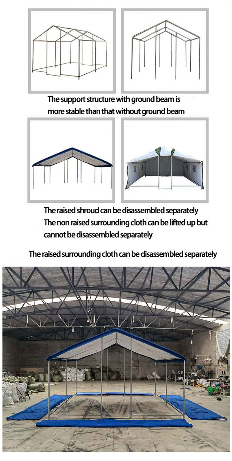 Аварійний намет – незамінний актив у численних критичних ситуаціях. Під час ліквідації наслідків стихійних лих, таких як урагани чи цунамі, він забезпечує негайне та безпечне укриття для постраждалих. Військові розраховують на нього для таборів швидкого розгортання під час місій. Медичні бригади використовують його як імпровізовані клініки для надання першої допомоги та лікування. Він також є ключовим елементом у пожертвах Організації Об'єднаних Націй, урядових резервах для забезпечення готовності до стихійних лих та операціях Червоного Хреста. Цей намет має просту в збірці конструкцію, що дозволяє швидко встановити його навіть у найнагальніших обставинах. Більше того, він доступний у широкій кольоровій гамі, що дозволяє вам вибрати той, який відповідає вашим конкретним потребам. Його високоякісна конструкція забезпечує довговічність та тривалий термін служби.
