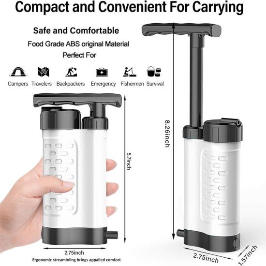 Цей очищувач води для ліквідації наслідків стихійних лих розміром 14,4x7,8 см має чудову фільтраційну здатність, повністю видаляючи домішки та шкідливі речовини з вашого джерела води, гарантуючи, що кожен ковток води, який ви вип'єте, буде чистим. Він також має дуже високу швидкість потоку, виробляючи 1500 мл (1,5 літра) чистої води за хвилину, тому вам не доведеться довго чекати під час активного відпочинку на свіжому повітрі.