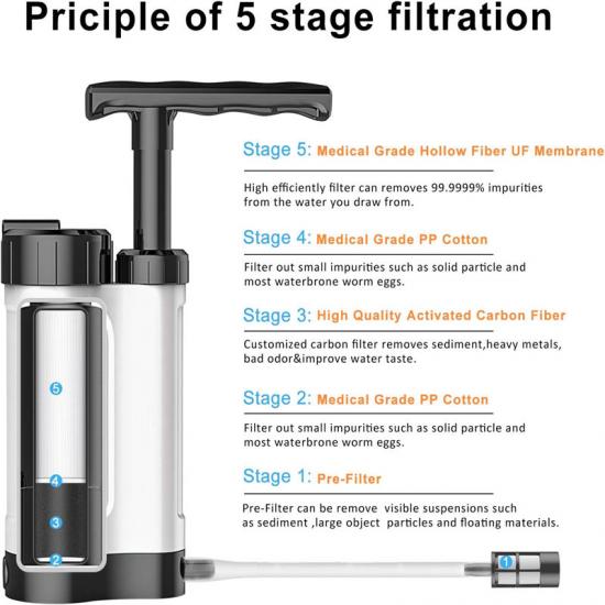 Система фільтрації очищувача води розміром 8,3x1,6 дюйма для ліквідації наслідків стихійних лих складається з ультрафільтраційної мембрани з порожнистих волокон медичного класу та поліпропіленової бавовни, які працюють разом, ефективно видаляючи з води 99,9999% хлору, важких металів, хімічних забруднювачів, осаду та інших частинок. Крім того, для подальшого покращення ефекту фільтрації ми також додали високоякісне активоване вугілля з кокосової шкаралупи, яке може адсорбувати та видаляти запахи та шкідливі речовини з води, забезпечуючи вам чисту та здорову питну воду.