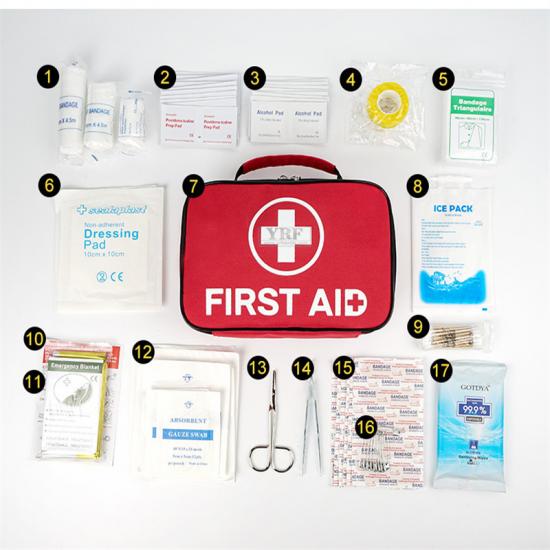 ПБТ-стрічка *3, таблетки йодофору *20, спиртові таблетки *20, пластир *2, трикутний бинт *1, кровоспинна подушечка *2, аптечка першої допомоги *1, пакет з льодом *1, мішечок з ватними тампонами *1, інструкція із застосування *1, ковдра для першої допомоги *1, марлева подушечка (три розміри) *6, ножиці *1, пінцет *1, прямокутний пластир *30, англійська шпилька *10, дезінфікуючі вологі серветки *1
