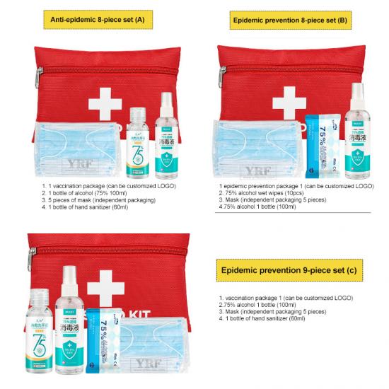 1. 1 пакет для профілактики епідемій (з можливістю налаштування логотипу), 2. пляшка 2,75% спирту (100 мл), 3. Маска (5 штук в індивідуальній упаковці), 4. 1 пляшка дезінфікуючого засобу для рук (60 мл)