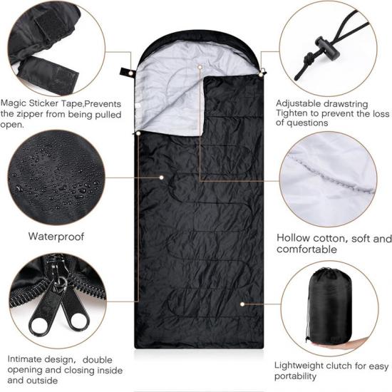 Аварійний спальний мішок з поліестеру. Розміри: 82,68 x 29,53 дюйма / 210 x 75 см. Вага: 1,4 кг. Він достатньо просторий і комфортний, щоб вмістити людей будь-якого розміру. Завдяки надійній конструкції, наш водонепроникний спальний мішок м'який, зручний і стійкий до вітру та дощу, що дозволяє йому витримувати суворі умови. Крім того, цей легкий і зручний у перенесенні туристичний спальний мішок розроблений з урахуванням низької ваги та має кишеню для зберігання, яка легко поміщається у ваш рюкзак.