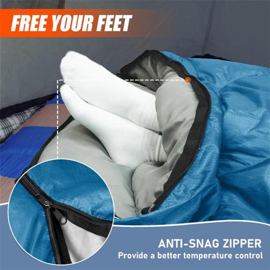Крім того, спальний мішок має капюшон зі шнурком у верхній частині, який утримує тепле повітря всередині та холодне зовні, не заважаючи вашій голові та шиї.