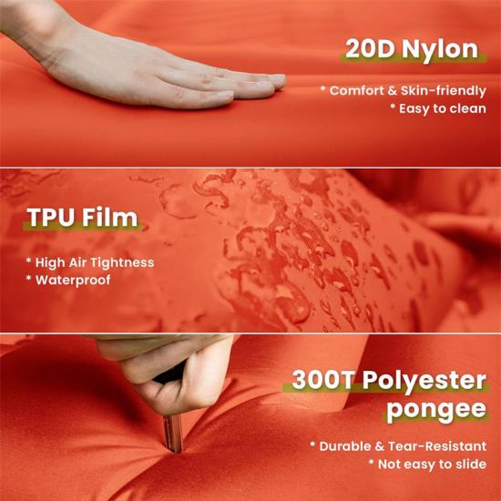 A: Надувний спальний килимок, підготовлений для екстрених випадків, виготовлений з подвійно потовщеного нейлону 20D та поліестеру 300T