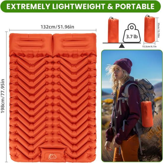 Цей подвійний надувний килимок для сну має розміри 78x52x3,5 дюйма / 198x132x9 см і важить лише 3,7 фунта / 1,6 кг.
