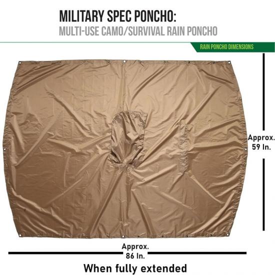 Підкладка для пончо з водонепроникністю 3000 мм виготовлена з високощільної тканини з ріпстоп-поліестеру та поліуретанового покриття, що забезпечує відмінний водонепроникний показник 3000 мм. Пончо має розміри приблизно 59 дюймів завширшки та 86 дюймів завдовжки, що достатньо для розміщення більших рюкзаків. Розмір сумки для перенесення приблизно 6 x 8 x 3 дюйми. Його загальна вага становить 18 унцій, а регульований капюшон зі шнурком забезпечує надійну та комфортну посадку. Пончо також має регульований шнурок з капюшоном діаметром 9 дюймів, що дозволяє користувачеві легко регулювати його за потреби.