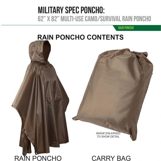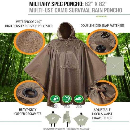 Водонепроникний підкладковий пончо забезпечує сухий захист від негоди в надзвичайних ситуаціях, пов'язаних з ліквідацією наслідків стихійних лих, а для тих, хто потребує виживання в надзвичайній ситуації, він пропонує різноманітні способи захисту від зовнішнього середовища та забезпечує комфорт. У військових умовах багатоцільове пончо може використовуватися як спорядження для таємних тактичних операцій, зменшуючи натирання та різкий шум.