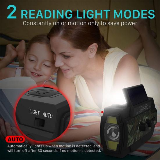 Цей аварійний радіоприймач із 4 світлодіодними лампами для читання — це більше, ніж просто засіб зв'язку, він пропонує два варіанти освітлення: 4 світлодіодні лампи для читання та режим ліхтарика потужністю 1 Вт. Ці джерела світла забезпечують миттєве освітлення у разі відсутності або перебоїв у електроживленні, забезпечуючи безпеку вам та вашій родині.