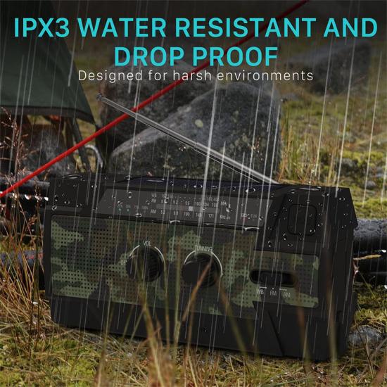Компактне аварійне радіо. Три варіанти живлення забезпечують постійну підтримку живлення. Функція ручного генерування енергії та сонячна панель призначені для рекуперації енергії в будь-яких умовах, гарантуючи роботу радіо, освітлення та функції сигналізації SOS у надзвичайних ситуаціях. Навіть коли відновлювані джерела енергії недоступні, резервна батарейка типу AAA є останнім засобом для забезпечення безперебійного живлення.