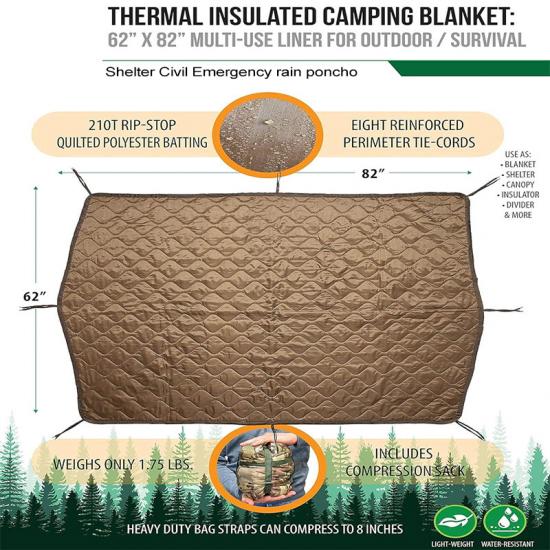 ФУНКЦІЯ: Дощовик-пончо з поліестеру та бавовни не тільки забезпечує тепло та захист від більшості погодних умов, а також від перепадів температур, але також може використовуватися як швидковисихаючий тимчасовий намет для виживання, тент, утеплювач для гамака, подушка, перегородка для намету, екран для конфіденційності, інструмент для перенесення в екстрених ситуаціях, засіб для ліквідації наслідків стихійних лих, прихований бункер, сумка для перенесення, спальний мішок або утеплювач для намету.
