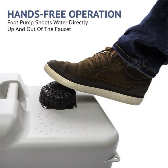 Цей аварійний умивальник для рук, виготовлений у Китаї, оснащений великою стільницею та резервуаром для води об'ємом 19 літрів, може забезпечити понад 100 мийок за одне наповнення. Його ножний насос призначений для ручного розпилення 180 мл прісної води через кран без необхідності використання двох рук, що зручно та гігієнічно, а також екологічно та енергозберігаюче.