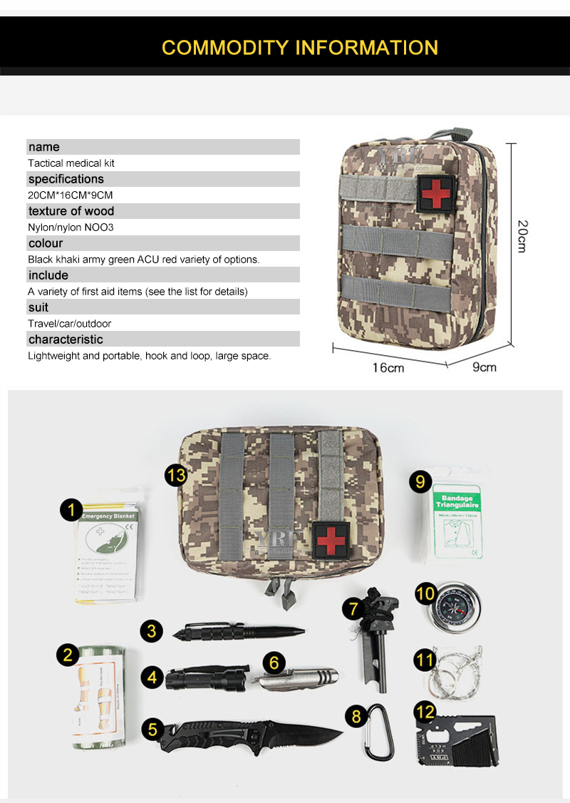 Зручний дизайн ідеально підходить для будь-якого використання та перенесення широкого спектру інструментів та обладнання. Ви переконаєтеся, що що б ви не хотіли взяти з собою, аптечки YRF Outdoor Camping Emergency Kits Tactical First Aid