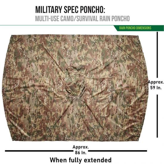 Т Розміри пончо приблизно 59 дюймів завширшки та 86 дюймів завдовжки, що достатньо для розміщення більших рюкзаків. Розмір сумки для перенесення приблизно 6 x 8 x 3 дюйми. Тим часом, пончо важить 18 унцій, але розроблено таким чином, щоб бути легким та зручним для перенесення.