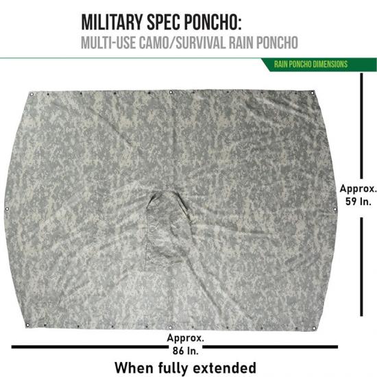 Проект Poncho Liner Engineering Rain Construction Sp уточнення : Виготовлений з високощільного ріпстоп-поліестеру 210T з поліуретановим покриттям, цей дощовик має чудовий водонепроникний показник 3000 мм. Його кишені для перенесення шириною 6 дюймів достатньо широкі, щоб вмістити різноманітні предмети, тоді як загальна довжина 86 дюймів достатньо широка, щоб вмістити більші рюкзаки. Його регульований капюшон зі шнурком та вісім міцних металевих люверсів забезпечують користувачам гнучкість та зручність. Зі загальною вагою 18 унцій, він помірно важкий і його легко носити з собою.