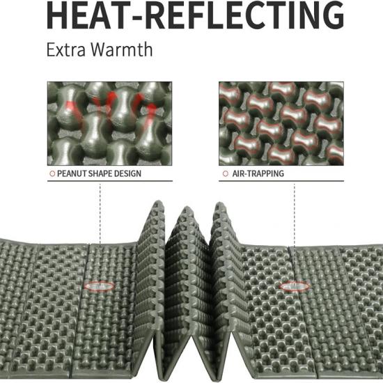 Щоб задовольнити потреби більшої кількості користувачів, ми випустили оновлену версію пінопластового килимка для сну. Цей легкий армійський пінопластовий килимок для сну, доступний онлайн, покритий алюмінієвою плівкою – легким покриттям, яке дуже ефективно відбиває тепло, покращуючи тепло, не додаючи зайвої ваги чи об’єму. Зручний пінопластовий килимок для сну, доступний онлайн, також є вологостійким, міцним та легким у догляді, що робить ваш досвід ще кращим.