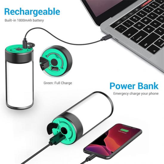 Водонепроникний клас IPX4 та вбудований акумулятор ємністю 1800 мАг, що усуває необхідність заміни батареї. Завдяки гачку зверху, ви можете повісити його на дерево або всередині намету для кращого освітлення.