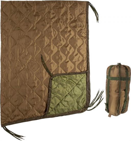 A: Підкладка для пончо Military compression sack виготовлена з щільно плетеного міцного нейлону та має водонепроникні властивості. Внутрішня частина наповнена швидковисихаючою поліестеровою бавовною, яка є одночасно теплою та вологонепроникною.