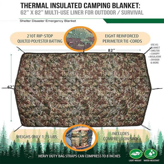 ПРАКТИЧНІСТЬ: Цей великий вітрозахисний намет-пончо має широкий спектр використання, його можна використовувати як тимчасовий намет для виживання, що швидко висихає, тент, утеплювач для гамака, подушку, перегородку для намету, екран для конфіденційності, інструмент для перенесення в надзвичайних ситуаціях, засіб для ліквідації наслідків стихійних лих, приховане укриття, сумку для перенесення, спальний мішок або утеплювач для намету тощо. Забезпечує гарне тепло та захист як для індивідуального, так і для групового використання.