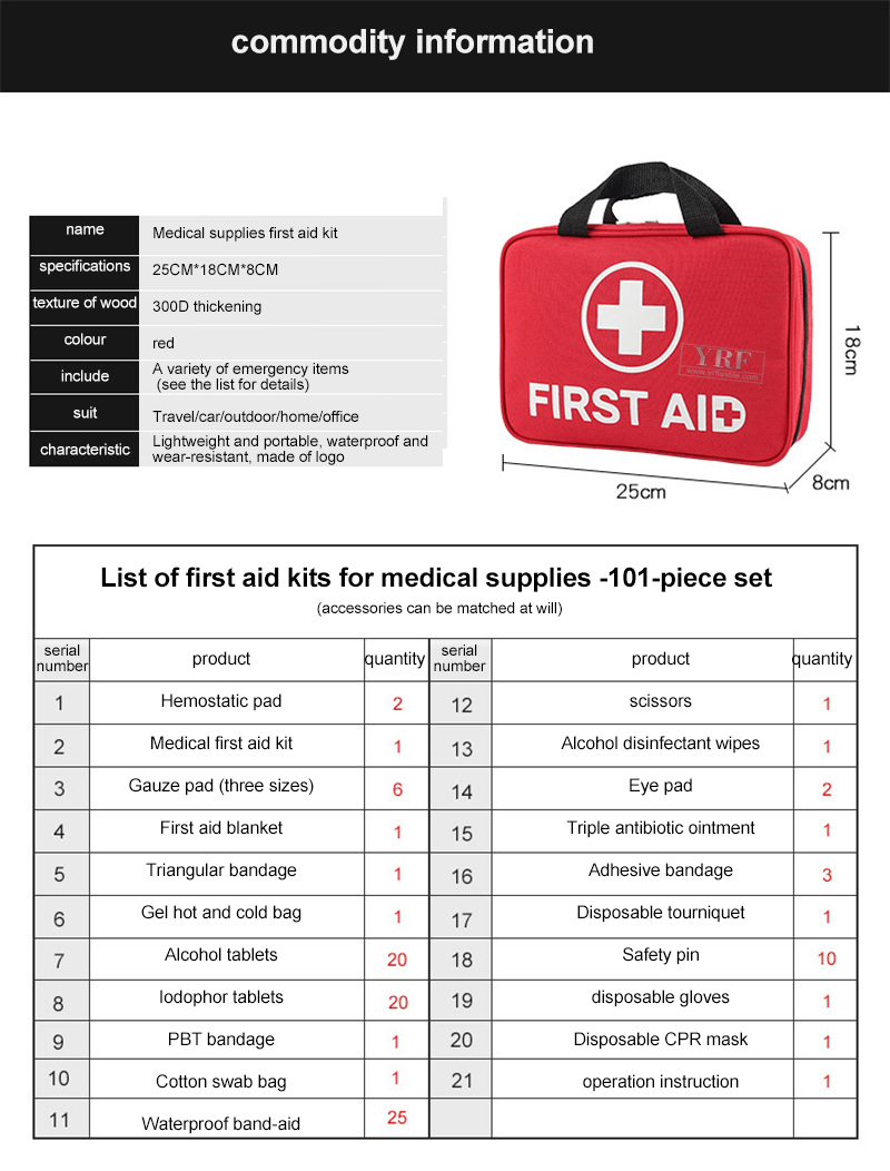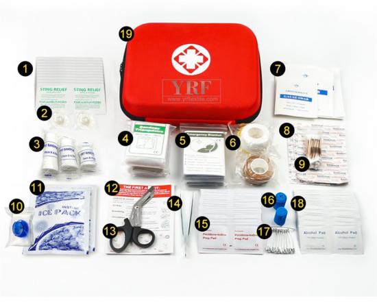 Таблетки Zhiyang *20, Пластир *2, ПБТ-бинт (три розміри) *3, Трикутний бинт *2, Ковдра для першої допомоги *2, Пластир *2, Марлева подушечка (три розміри) *6, Водонепроникний пластир *20, Ватний тампон *30, Чохол для серцево-легеневої реанімації *1, Охолоджувальний пакет з льодом *1, Інструкція із застосування *1, Ножиці *1, Пінцет *1, Таблетки йодофору *20, Одноразовий джгут *2, Шпилька *10, Спиртові таблетки *50, Портативний рятувальний пакет з EVA *1