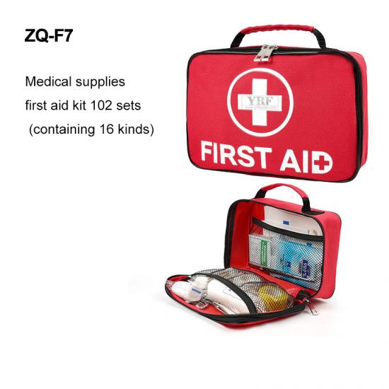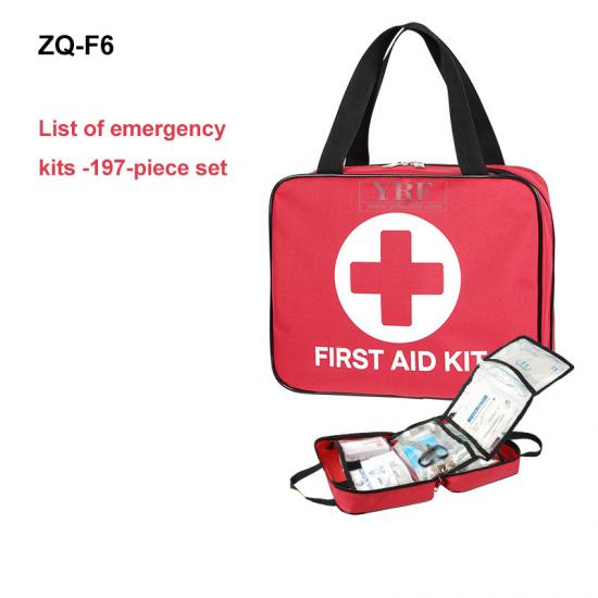 Марлева серветка (розмір 2) *4, Подушка для очей *2, Таблетки йодофору *100, Аптечка для екстреної допомоги *1, Пластир *20, Мішечок з ватними тампонами *2, Пакет з льодом *1, Пластир PBT *4, Маска N5 *5, Ножиці *1, Спиртові таблетки *50, Дезінфікуючі вологі серветки *1, Рукавички з ПВХ *2, Трикутний бинт *2, Ковдра для надання першої допомоги *2