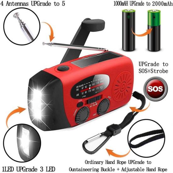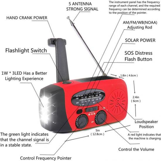 5,0x2,3x1,7 дюйма. Радіоприймач Червоного Хреста приймає 7 каналів прогнозів погоди в режимі реального часу, таких як землетруси, урагани, торнадо та сильні шторми. Мобільний блок живлення ємністю 2000 мАг забезпечує достатньо аварійного живлення для будь-якого мобільного пристрою у разі надзвичайної ситуації, вбудований аварійний ліхтарик з 3 світлодіодами та чіп сигналізації SOS, тривале натискання SOS протягом трьох секунд може надіслати міжнародний сигнал лиха.