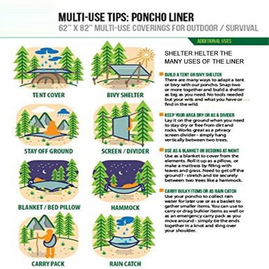 Це Підкладка для дощового пончо з поліестеру Універсальність: Підкладка для пончо Relief Rescue має шнурок на талії, який забезпечує додаткові 16 дюймів регулювання. Крім того, пончо має 8 міцних металевих люверсів для фіксації підкладки, що забезпечує додаткову ізоляцію та зручне використання як кріплення для шнурка. Це означає, що пончо можна використовувати не лише як засіб захисту від дощу, але й як парасольку, намет для виживання, намет для збору води, рюкзак для перенесення, носилки для екстреного перенесення, чохол для гамака, роздільник для намету, екран для конфіденційності, прихований бункер та багато іншого. Ця універсальність робить багатоцільове пончо корисним у різних сценаріях.