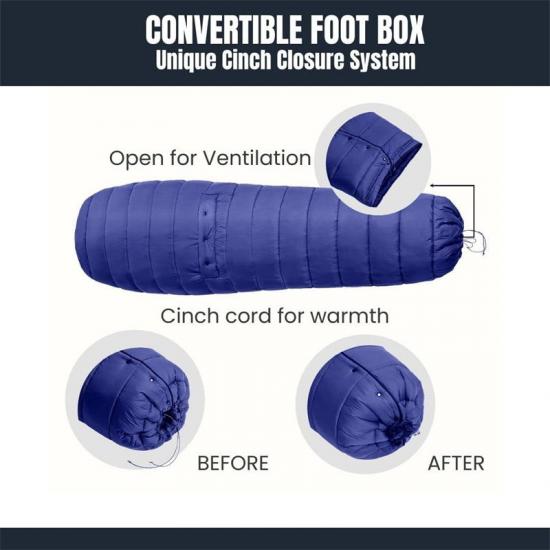 Цю верхню ковдру також можна використовувати як спальний мішок завдяки трансформованій підніжці, яка розроблена для підвищення тепла, комфорту та ефективності, забезпечуючи додаткову ізоляцію для ваших ніг. У теплі ночі ви можете відкрити устілку для кращої циркуляції повітря. У холодніших умовах щільне зав'язування шнурів забезпечує оптимальне тепло. Чи то тепла ніч, чи холодна погода для сну, цей спальний мішок від Rescue Equipment пропонує комфорт та зручність.