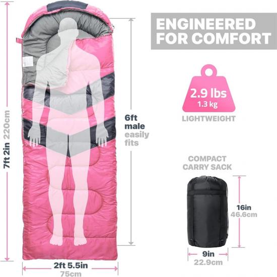 Наші спальні мішки виготовлені зі 100% поліестеру, мають розмір 220 см x 80 см і важать лише 1,3 кг. Високоякісні спальні мішки підходять для використання навесні, влітку, восени та в прохолодну погоду, розраховані на температуру від 4°F до 25°C, з оптимальною комфортною температурою від 15°C до 24°C.