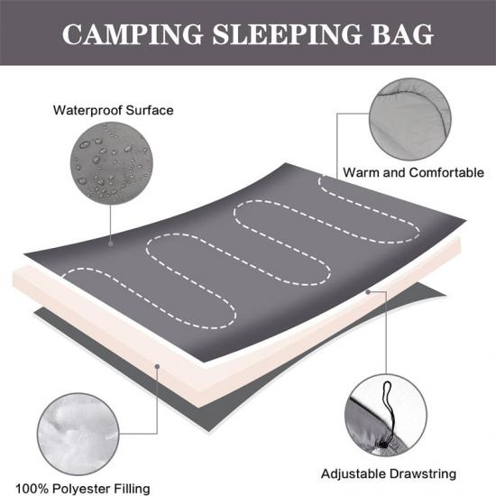 Поверхневе покриття спального мішка з тканини ріпстоп з поліестеру — це сухий молекулярний склад, який є водонепроникним, повітропроникним та вологостійким, що забезпечує йому гарну стійкість до дощу або запиленої погоди.