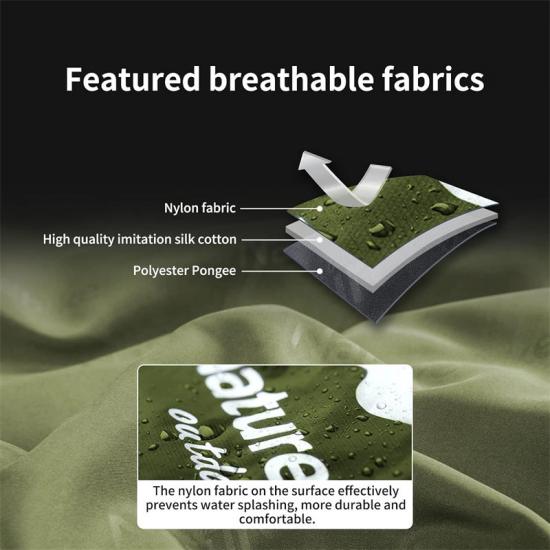 Матеріал повітропроникного захисного спального мішка: Наші спальні мішки виготовлені з високоякісних нейлонових та поліестерових матеріалів, які є міцними, довговічними та легкими у догляді. Наш наповнювач виготовлений зі штучного шовку та бавовни щільністю 80 г/м², що забезпечує комфортний сон і водночас значно економить місце.
