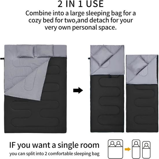 A: Ліву та праву блискавки спального мішка можна застібнути одночасно, перетворюючи його на двошаровий спальний мішок; дно спального мішка можна відкрити та вентилювати, не задушуючи, і його легко переміщати, щоб справлятися з різними ситуаціями.