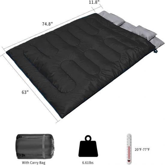 Розмір спального мішка для допомоги під час повені становить 63*86,6 дюймів /160*230 см, а просторий прямокутний дизайн забезпечує максимальний комфорт, підходить для 3-4 сезонів, а номінальна температура становить 5℃-25℃.