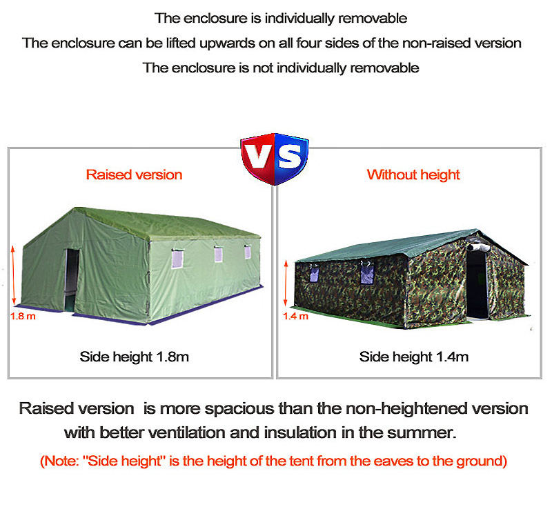 У разі таких стихійних лих, як землетруси, повені чи тайфуни, наш аварійний намет є першою лінією захисту для екстреної допомоги у разі стихійного лиха. Це також надійний вибір для військових операцій, що забезпечує швидку базу в польових умовах. Медичні команди покладаються на нього для створення тимчасових зон лікування в надзвичайних ситуаціях. Крім того, він є основним елементом пакетів допомоги Організації Об'єднаних Націй, урядових резервів надзвичайних ситуацій та місій з надання допомоги під керівництвом Червоного Хреста. Виготовлений з першокласних водонепроникних та міцних матеріалів, він може витримувати найсуворіші погодні умови. Оберіть з широкого спектру кольорів, незалежно від того, чи потрібен вам яскравий помаранчевий колір для пошуково-рятувальних операцій, чи більш приглушений відтінок для військового використання.
