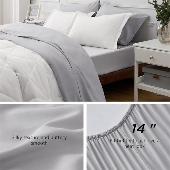 Цей зручний комплект постільної білизни з Китаю оптом від Організації Об'єднаних Націй постачається в широкому асортименті розмірів, щоб задовольнити потреби двоспального ліжка. Він включає 1 ковдру 260x240 см, 1 простирадло на резинці 210x180x35 см, 1 простирадло на резинці 270x260 см, 2 наволочки 50x100 см та 2 наволочки 50x90 см.