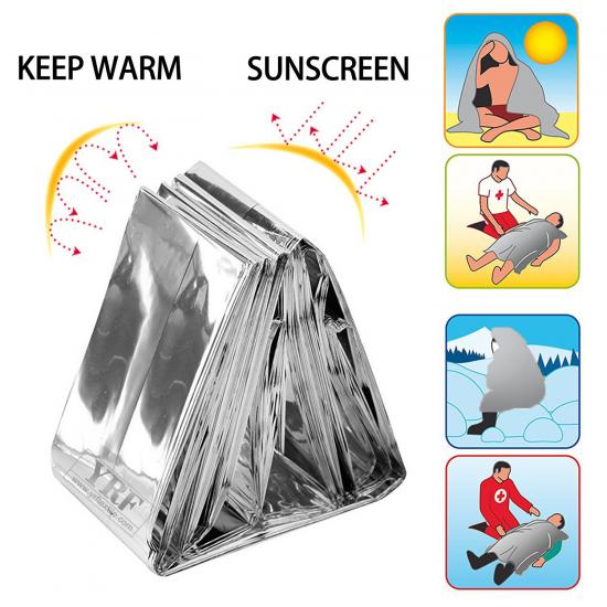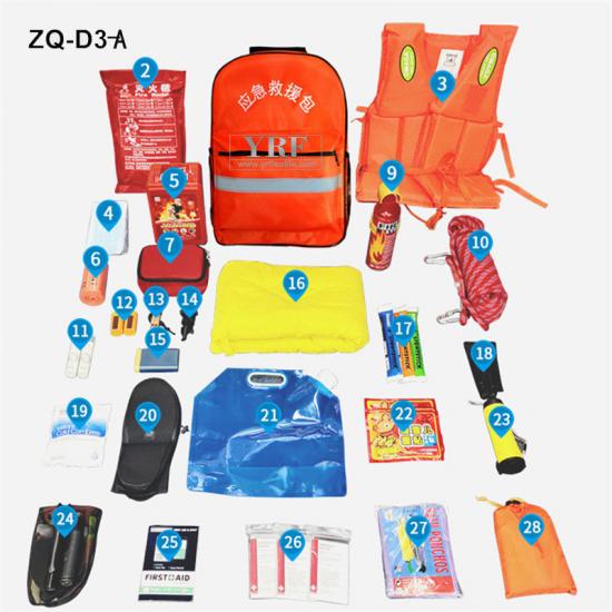 виживання спорядження, таке як ковдри для екстрених випадків, ножиці, свистки та багатофункціональні кишенькові картки, натискання спалаху